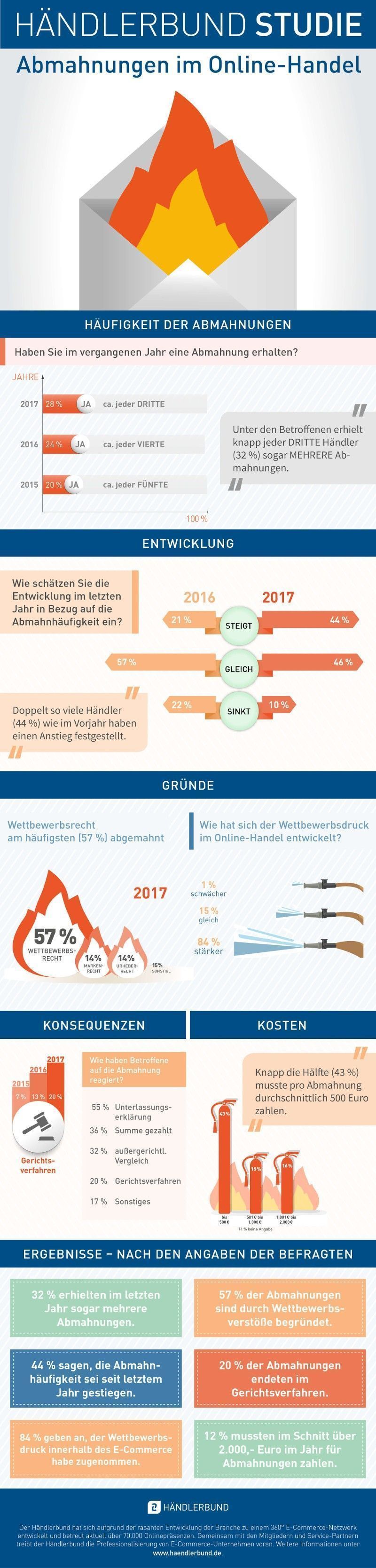 Abmahnungen, Wettbewerbsdruck, Gerichtsverhandlungen – die aktuelle Abmahnstudie des Händlerbundes zeichnet ein düsteres Bild für den Online-Handel. Seit 2015 erhöht sich die Zahl der Online-Händler, die eine teure Abmahnung erhalten haben, stetig von 20 auf inzwischen 28 Prozent! Anstatt innerhalb der Branche zusammenzuhalten, ist es normal geworden, Mitbewerber wegen Kleinigkeiten abzumahnen. Hier gibt es die beunruhigenden Zahlen aus der Studie…