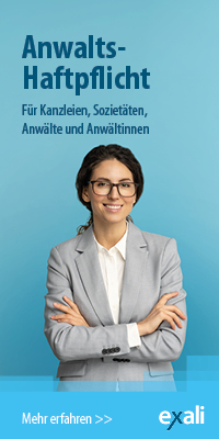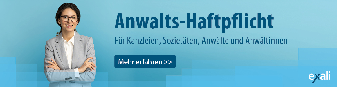 Ob eine versäumte Frist, ein Beratungsfehler oder eine Verletzung der Geheimhaltungspflicht: Unterläuft Ihnen als Anwältin oder Anwalt ein berufliches Versäumnis, drohen im schlimmsten Fall horrende finanzielle Konsequenzen. Die Anwaltshaftpflicht über exali bietet Ihnen im Rahmen der gesetzlich vorgeschriebenen Versicherung verlässlichen Schutz vor Vermögensschäden und sichert den Kanzleibetrieb auch gegen Personen- und Sachschäden ab.