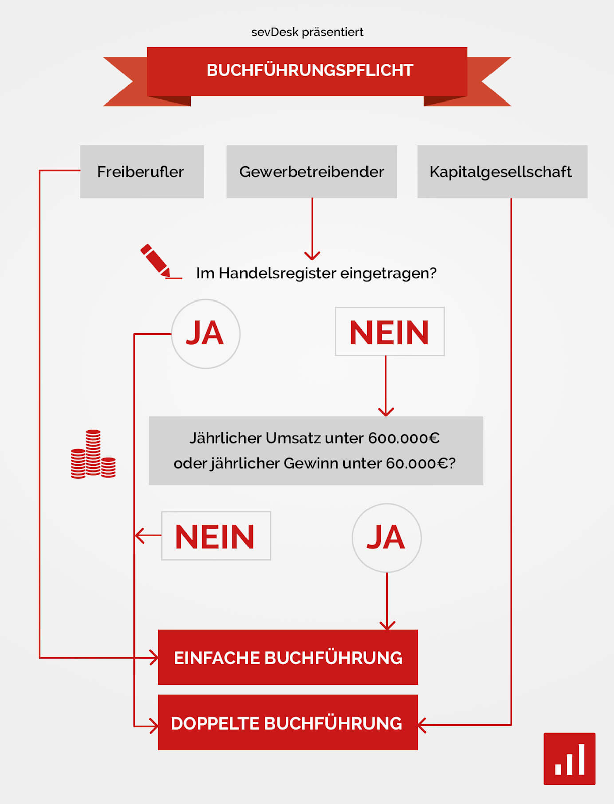 Bei der doppelten Buchführung müssen sämtliche Geschäftsvorfälle ordnungsgemäß verbucht werden. Am Jahresende muss zur Gewinnermittlung eine Bilanz sowie eine Gewinn- und Verlustrechnung erstellt werden. Bei der einfachen Buchführung hingegen wird eine Einnahmen-Überschuss-Rechnung erstellt. Dabei werden die Betriebseinnahmen und Betriebsausgaben eines Geschäftsjahres gegenübergestellt und der Gewinn oder Verlust ermittelt. Dieses einfachere Verfahren ist besonders für Selbstständige geeignet, da es weniger komplex ist und größtenteils ohne Hilfe eines Steuerberaters angewendet werden kann.