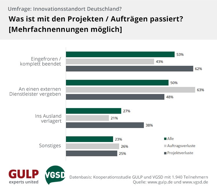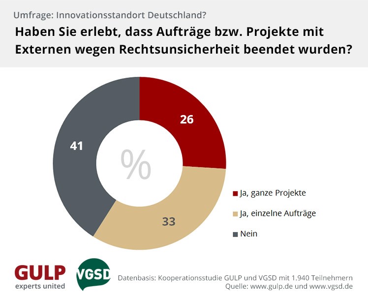 Mit einer Umfrage wollten der VGSD (Verband der Gründer und Selbstständigen Deutschland e. V.) und Personaldienstleister GULP beweisen, dass durch die Rechtsunsicherheit beim Thema Scheinselbständigkeit Know-how und Projekte ins Ausland abwandern. Das hatte die Bundesregierung auf Anfrage bestritten.